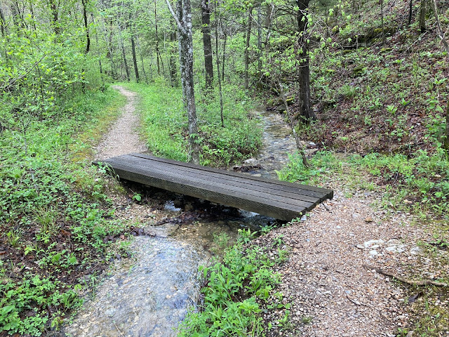 Our day was dominated by the hike we did on the Pigeon Roost trail in Hobbs State Park. This trail works it's way in and out of ravines above a lake. There were some little streams, a lot of good tranquil lake overlooks and lots of flowering trees and small trail side wildflowers. Most remarkable to me was that despite a storm the night before, this trail wasn't wet, muddy or torn up at all. In fact the entire 8.5 miles is in extremely fine shape with no obstacles to speak of. The grading of the trail is so consistent and gentle that it went by pretty quickly and the 1000 feet elevation gain wasn't a trudge at all.